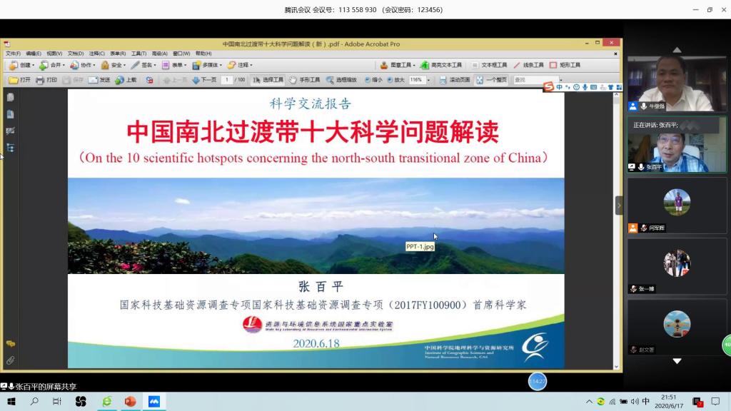6月17日,应太阳集团tyc234cc邀请,中国科学院地理科学与资源研究所张百平研究员通过网络视频的方式为地理学院师生作了题为“中国南北过渡带十大科学问题解读”的学术报告。太阳集团tyc234cc部分教师、研究生和本科生参加了报告会,报告会由副院长牛继强教授主持。