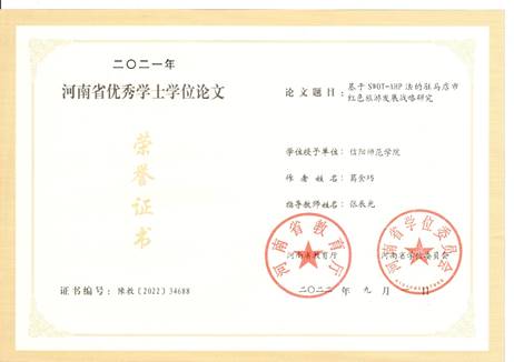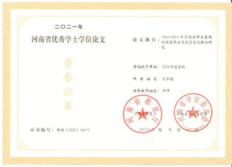 近日,河南省教育厅公布了2021年河南省优秀学士学位论文评选结果,我院2篇本科生学位论文获评优秀学士学位论文。获得优秀学士学位论文的分别是《1961-2019年河南省降水量观测误差修正及时空变化特征研究》(作者王弘超,论文指导老师颜伟)和《基于SWOT-AHP法的驻马店市红色旅游发展战略研究》(作者葛金巧,论文指导老师张辰光)。
