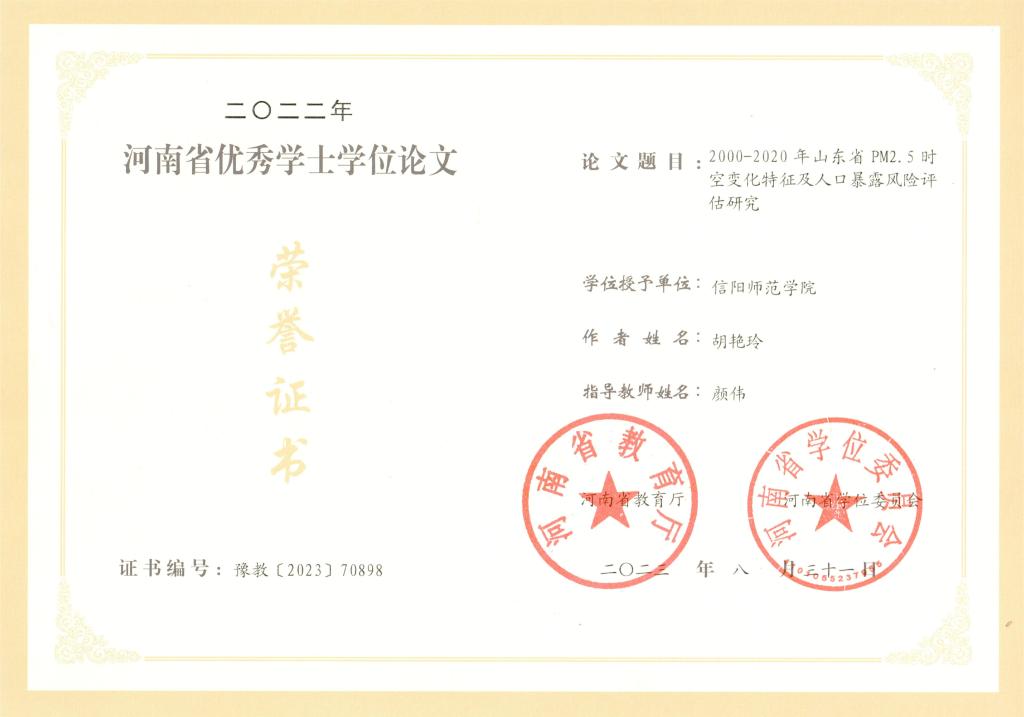 近日,河南省教育厅公布了2022年河南省优秀学士学位论文评选结果。我院2022届地理科学专业胡艳玲同学的学位论文《2000-2020年山东省PM2.5时空变化特征及人口暴露风险评估研究》获得河南省优秀学士学位论文。指导教师为颜伟博士。