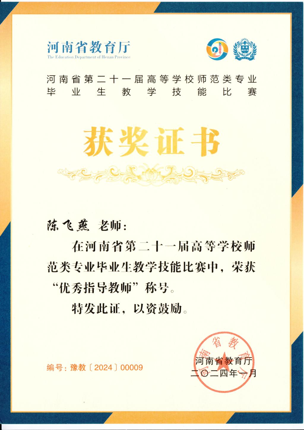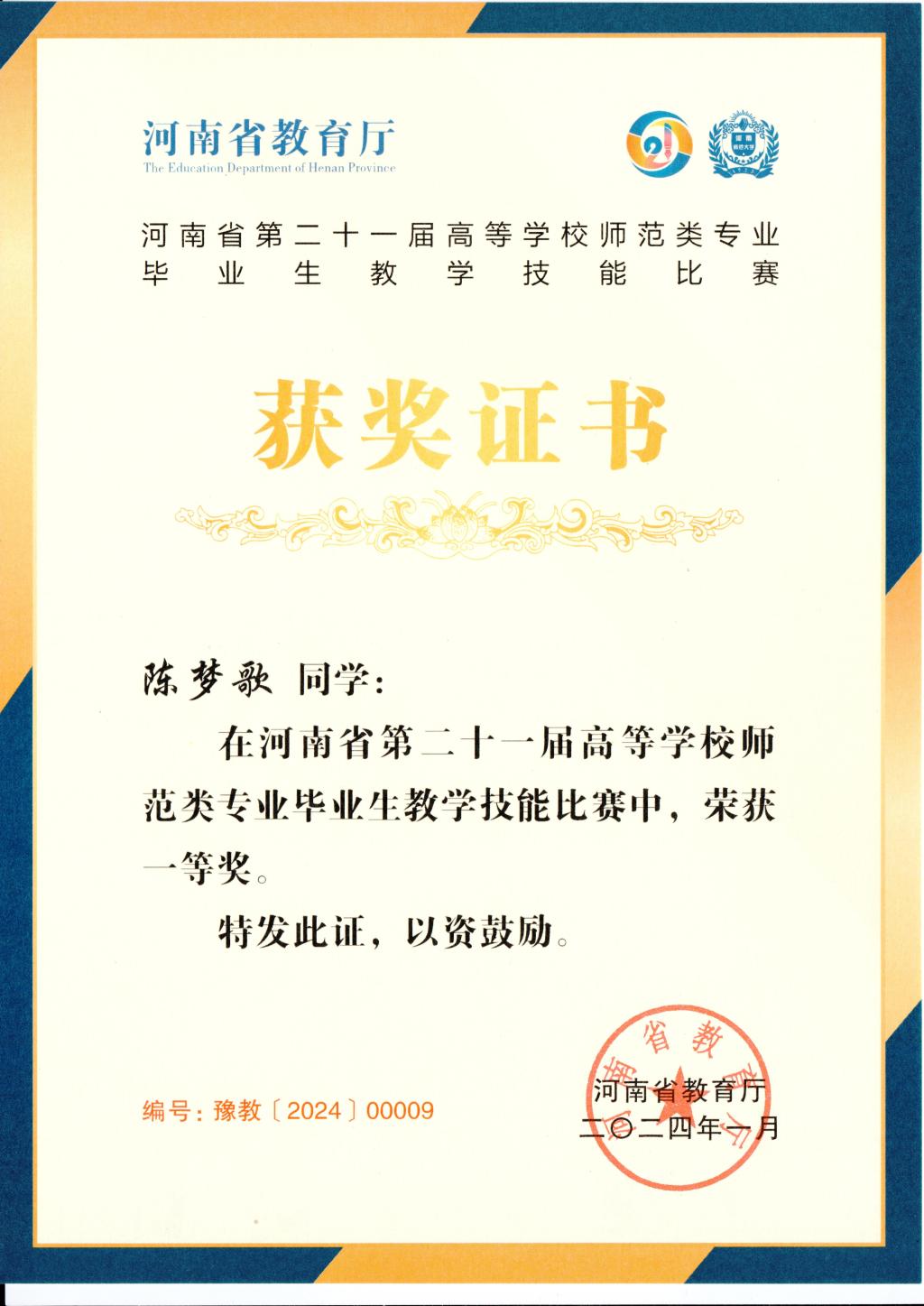 近日,河南省第二十一届高等学校师范类专业毕业生教学技能大赛在河南师范大学举办。我院2020级地理科学专业学生陈梦歌荣获一等奖,指导老师陈飞燕荣获优秀辅导奖。