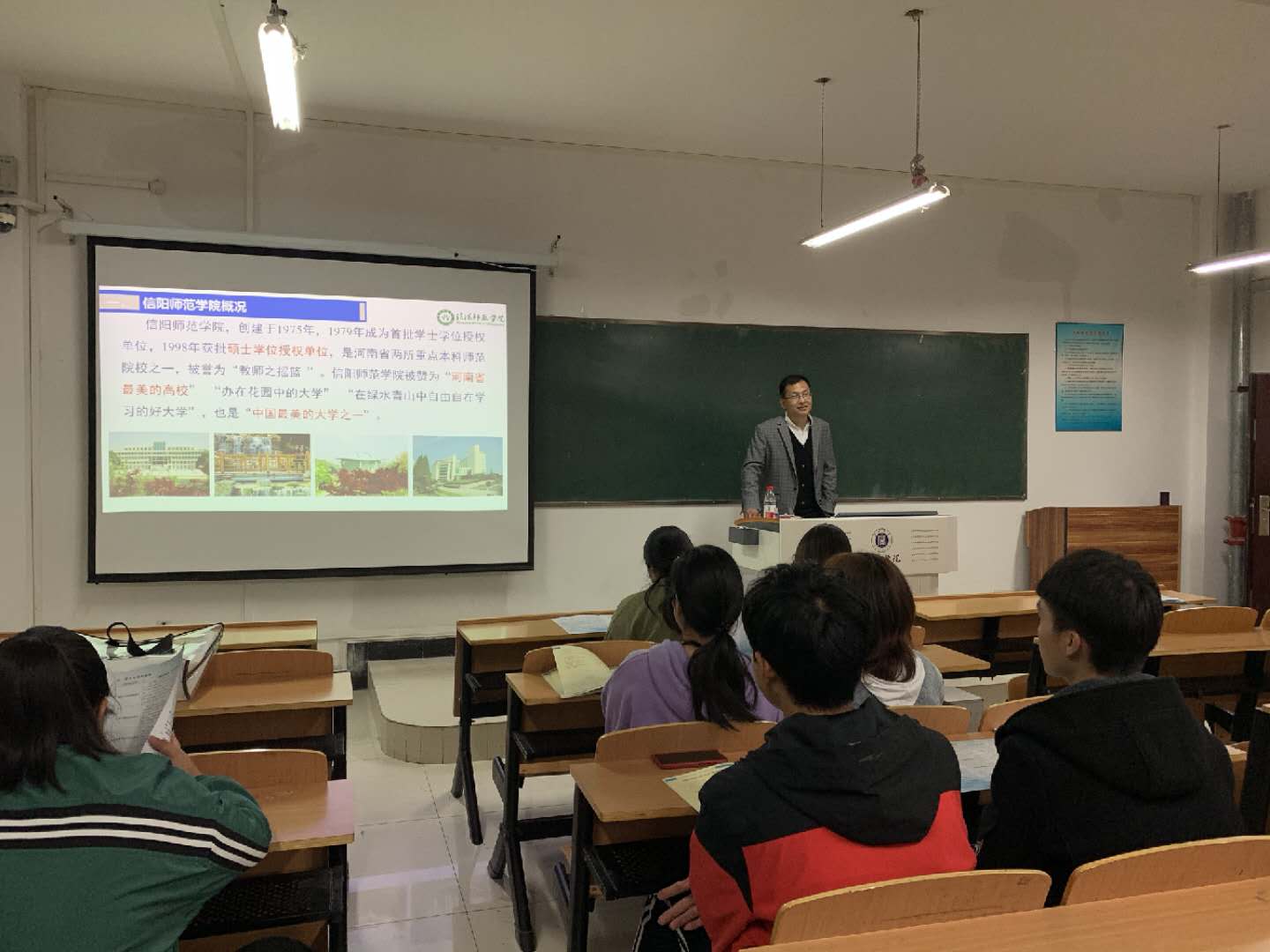 10月22日晚,太阳集团tyc234cc研究生工作秘书闫军辉副教授、学院研究生会主席易成功、职业规划部部长袁梦露一行前往信阳学院,于理工楼302室开展2021年研究生招生宣讲工作。信阳学院理工学院地理教研室主任魏新玲副教授、2017级与2018级近百余名学生参加了宣讲会,会议由魏新玲主任主持。