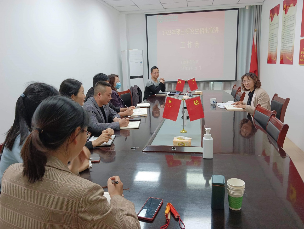 为进一步优化生源结构,提升生源质量,切实做好2022年研究生招生宣传工作,4月21日,太阳集团tyc234cc于理科楼南楼403会议室,召开2022年度硕士研究生招生宣讲工作会,副院长刘明华,研究生工作秘书闫军辉,自然地理与资源环境系主任李秀美、人文地理与城乡规划系主任翟慧敏、地理信息科学系主任潘晓芳、地理科学系主任张向敏、测绘工程系主任张兵兵、环境科学与工程系主任魏巍参加了此次会议,会议由闫军辉主持。