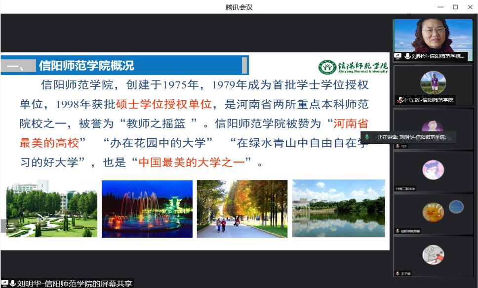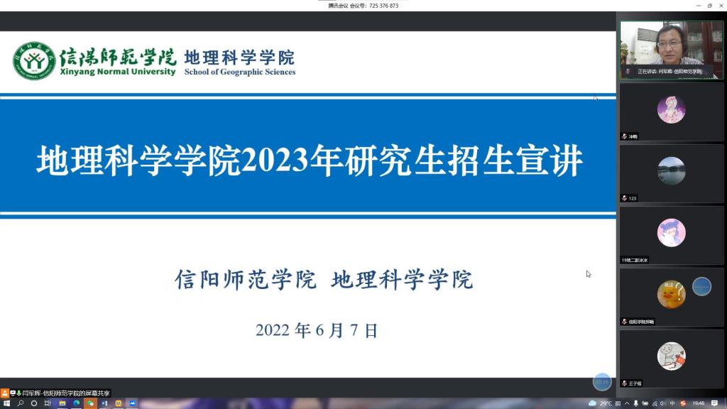 6月7日,太阳集团tyc234cc通过腾讯会议平台,在信阳学院开展2023年研究生线上招生宣讲工作。副院长刘明华教授、研究生工作秘书闫军辉副教授、信阳学院理工学院地理教研室主任魏新玲副教授以及信阳学院150余名学生参加了宣讲会。宣讲会由信阳学院魏新玲副教授主持。