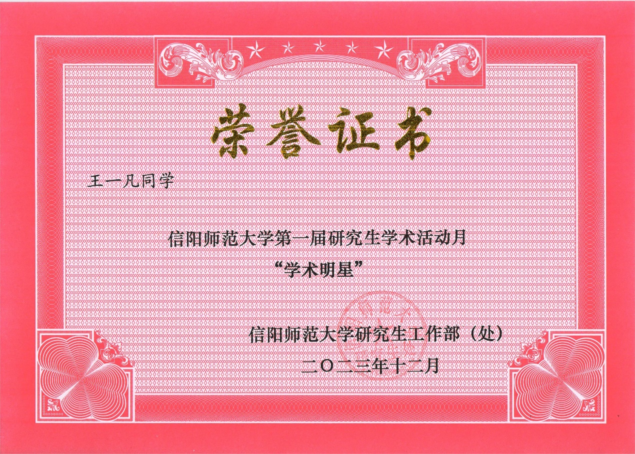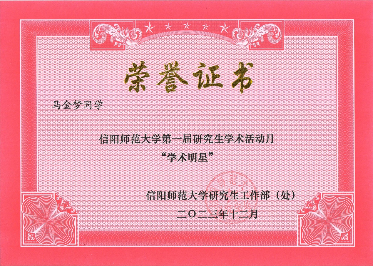太阳集团tyc234cc研究生“学术明星”面向全校研究生评选,是学术活动月的重要活动之一,从全校近2000名研究生中选出10名,历来受到学校师生的广泛关注,竞争十分激烈。此次王一凡和马金梦再次荣获“学术明星”荣誉,不仅充分展现了我院学子积极向上的精神风貌,也是对学院研究生教育的肯定和激励。今后,学院将认真落实立德树人根本任务,营造良好的学术氛围,发挥榜样引领作用,推动学院研究生教育工作更上一层楼,为高水平师范大学建设作出新的更大贡献。