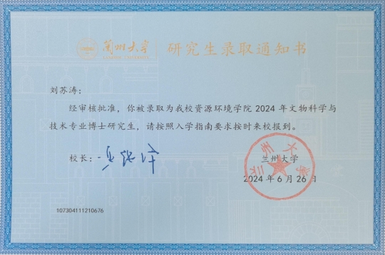 4月30日,兰州大学资源环境学院公布2024年博士研究生招生录取名单。我院2021级自然地理学硕士研究生刘苏涛同学通过申请考核,被录取为博士研究生。