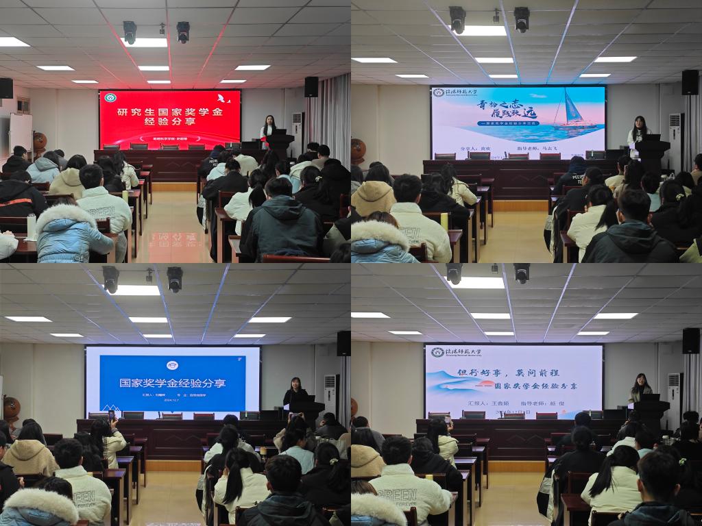 12月7日我院于理科楼南楼410会议室举办2024年研究生国家奖学金经验分享会。邀请我院2024年的国家奖学金获得者中的史超格、黄欢、刘瞳晖和王鑫颖分享经验,学院研究生60余人参加了分享会,分享会由研究生会刘瀚同学主持。分享会上,四位国奖获得者从各自独特的视角出发,详尽而生动地阐述了她们在科研征途中的深切体会。史超格着重指出平衡科研、学习与比赛是至关重要的。黄欢提到成功申请国奖离不开积极参与科研项目、努力发表高质量论文、广泛参加学术交流和竞赛。刘瞳晖重点分享了不同类型文献对自身能力提升的作用。王鑫颖从学习、情绪管理以及与人合作的心得感悟出发,强调了在科研压力下,保持心态平衡的重要性,并分享了提升自我的有效方法。自由交流环节,现场氛围热烈,同学们从学习生活、科研工作、社会实践等方面与国奖分享者深入交流,均表示受益良多。