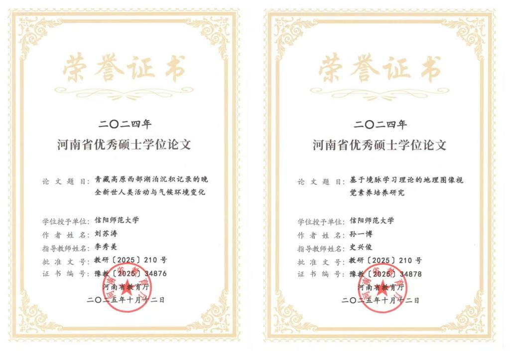 近日,河南省教育厅印发《关于公布 2024 年河南省优秀学位论文评选结果的通知》(教研〔2025〕210号》,公布了2024年河南省优秀硕士学位论文评选结果。我院2022级地理学专业刘苏涛同学(指导教师:李秀美)、学科教学(地理)专业孙一博同学(指导教师:史兴俊)的毕业论文获批为省优秀硕士学位论文。