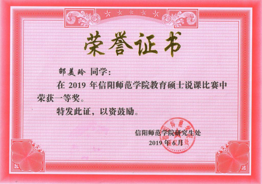 此次说课比赛由信阳师范学院研究生处主办,分为各教学单位选拔与学校决赛两个阶段。在学院举行的选拔赛中,邵美玲和师雅兰同学脱颖而出,与来自全校其他学院推荐的17名研究生一起参加了最后的角逐。在决赛阶段,两位研究生赛前精心准备、沉着应战,从说教材、说学生、说教学过程、说教学方法入手,全面阐述说课内容,表现了较好的驾驭教材、教学设计的能力和良好的语言表达能力,充分展示了我院研究生良好的教学技能。无论是教态、内容设计、重难点把握还是教学方法、多媒体等,都获得了现场评委老师及观众的一致认可。经过激烈角逐,师雅兰和邵美玲分别荣获第三名和第五名。