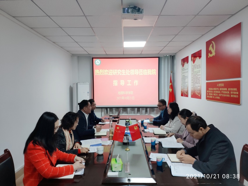 为迎接国家一级学科硕士学位授权点专项评估,10月21日,研究生处处长沈文慧,副处长仓玉萍,培养管理科科长宋宣玉,招生就业科科长周明成一行四人莅临太阳集团tyc234cc,开展地理学硕士学位授权点建设和评估准备工作专项调研。太阳集团tyc234cc院长牛继强、副院长刘明华、研究生工作秘书闫军辉、班主任郑茜参加了调研会。