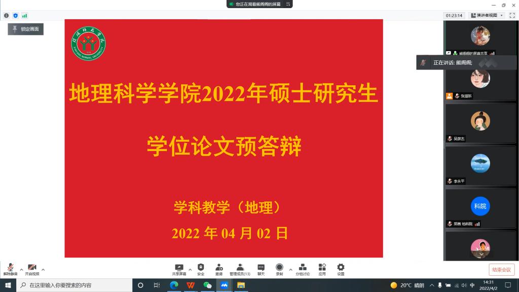 4月2日,我院2022届硕士研究生硕士论文预答辩以线上和线下结合的方式,在理科楼北楼1011室、1102教室、软科基地和腾讯会议平台举行。刘明华教授、颜俊博士、张兴国副教授、郜慧副教授、范辉副教授、杨先武副教授莅临会场并担任评委组组长,地理学和学科教学(地理)专业研究生60余人参加了预答辩评审会。