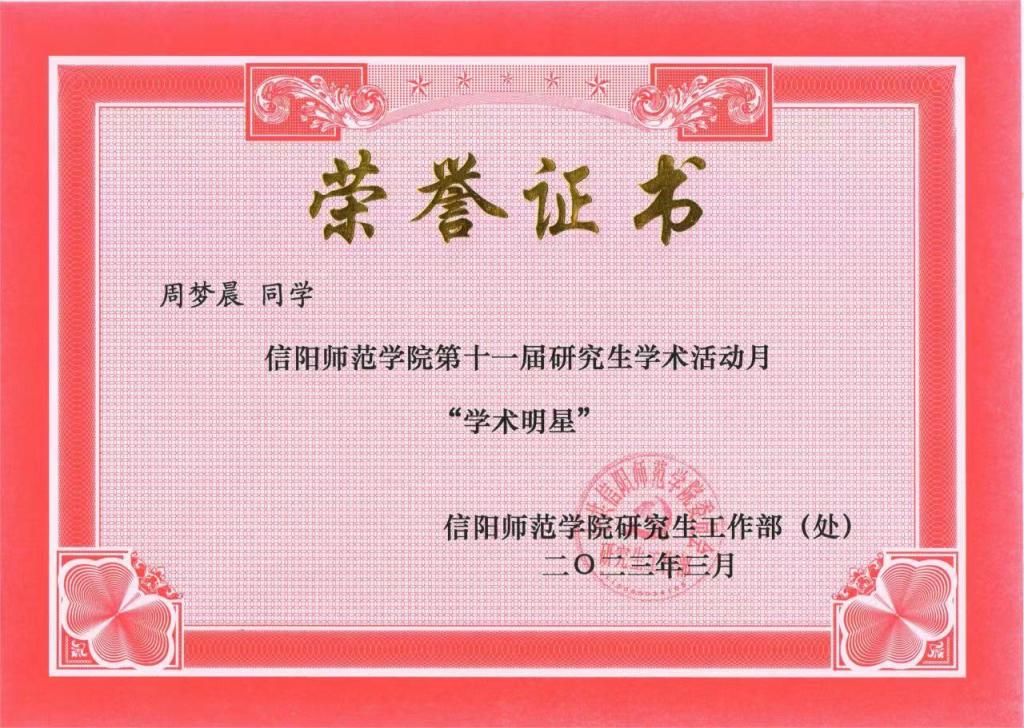 为继承和发扬优良学术传统,展示良好的学术风貌,学校启动了研究生活动月,开展了一系列活动,其中“学术明星”评选是学术活动月的重要内容之一。参赛选手围绕学术成果、社会实践、获奖情况等方面进行成果展示,每年评选10名,竞争十分激烈。经过精彩的展示,我院研究生周梦晨从近40名候选人中脱颖而出,荣获“学术明星”称号。入学以来,周梦晨同学深耕学术,潜心科研,积极参加各种学科竞赛,研究生期间以第一作者身份在《中学地理教学参考》发表文章一篇,以第二作者身份在《地理教育》发表文章一篇,在首届“田家炳杯”全国教育硕士教学技能大赛获“优秀教学设计”奖,主持2021年信阳师范学院研究生科研创新基金项目1项。学习之余,周梦晨同学曾担任学院研究生会职业规划部副部长,并荣获信阳师范学院“优秀研究生干部”称号。