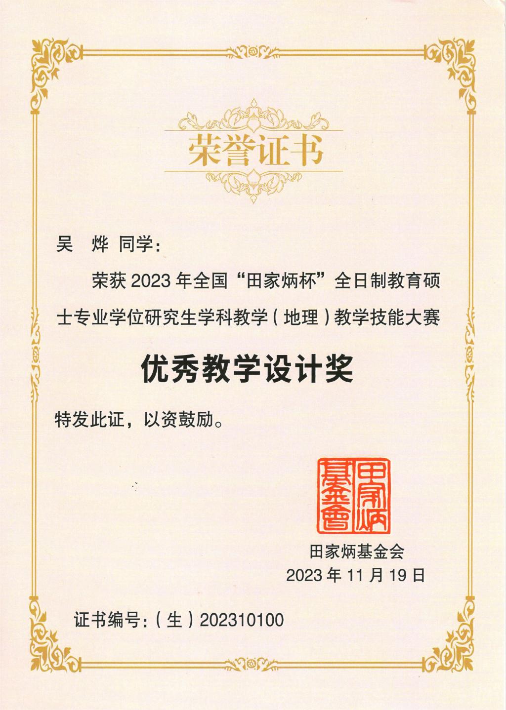 11月17—19日,2023年全国“田家炳杯”全日制教育硕士专业学位研究生学科教学(地理)教学技能大赛决赛在南京师范大学举行并圆满落幕。我院2022级学科教学(地理)专业研究生吴烨参加本次大赛并获得优秀教学设计奖。