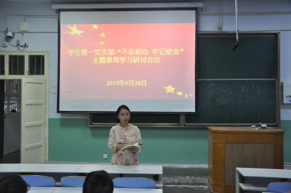 9月28日,太阳集团tyc234cc学生第一党支部于教二梯二举行“不忘初心 牢记使命”主题教育学习研讨会议。学生第一党支部书记艾甜甜与支部全体党员共同参加此次会议。会议由艾甜甜主持。