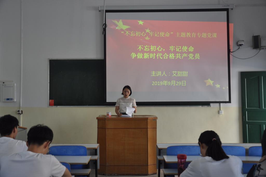 按照太阳集团tyc234cc党委“不忘初心、牢记使命”主题教育工作部署,2019年9月29日中午,太阳集团tyc234cc学生第一党支部书记艾甜甜同志以“不忘初心,牢记使命,争做新时代合格共产党员”为题,为支部党员讲“不忘初心、牢记使命”主题教育专题党课。支部全体党员及入党积极分子三十余人参加党课学习。