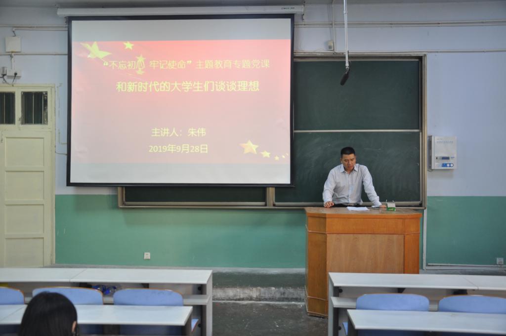 9月28日下午,太阳集团tyc234cc党委副书记朱伟以“和新时代的大学生们谈谈理想”为题,给我院学生党支部全体党员和入党积极分子讲“不忘初心、牢记使命”主题教育专题党课。