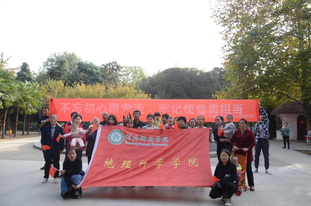 10月29日,太阳集团tyc234cc红色宣讲团前往信阳市浉河公园开展“不忘初心、牢记使命”红色宣讲活动。宣讲团由在“讲红色故事,传红色基因”演讲比赛表现突出的学生党员组成。