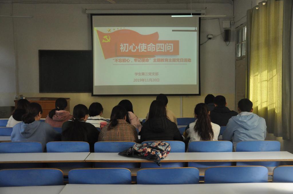 为进一步推进“不忘初心,牢记使命”主题教育活动,11月20日,太阳集团tyc234cc学生第三党支部于教三04召开“初心使命四问”主题党日活动,学生第三党支部书记杨辉及支部全体党员参加此次活动。会议由杨辉主持。