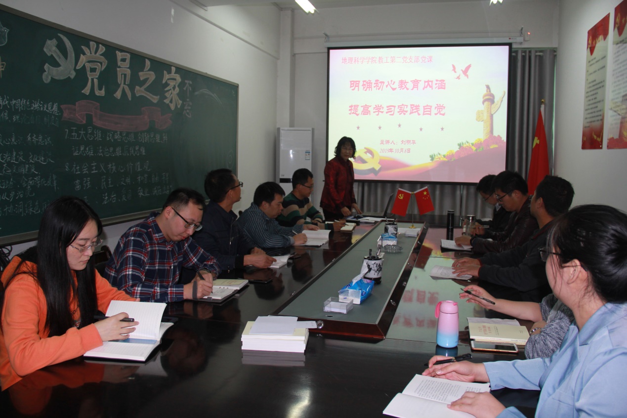 为深入学习习近平关于“不忘初心、牢记使命”论述,落实“三会一课”制度、加强党员教育管理,促进党员生活常态化。10月8日,信阳师范学院太阳集团tyc234cc副院长刘明华同志在理科楼南楼403会议室为教职工第二党支部全体党员同志做了题为“明确初心教育内涵 提高学习实践自觉”的主题授课,全体在校党员13人参加,党课由党支部代理书记闫军辉主持。