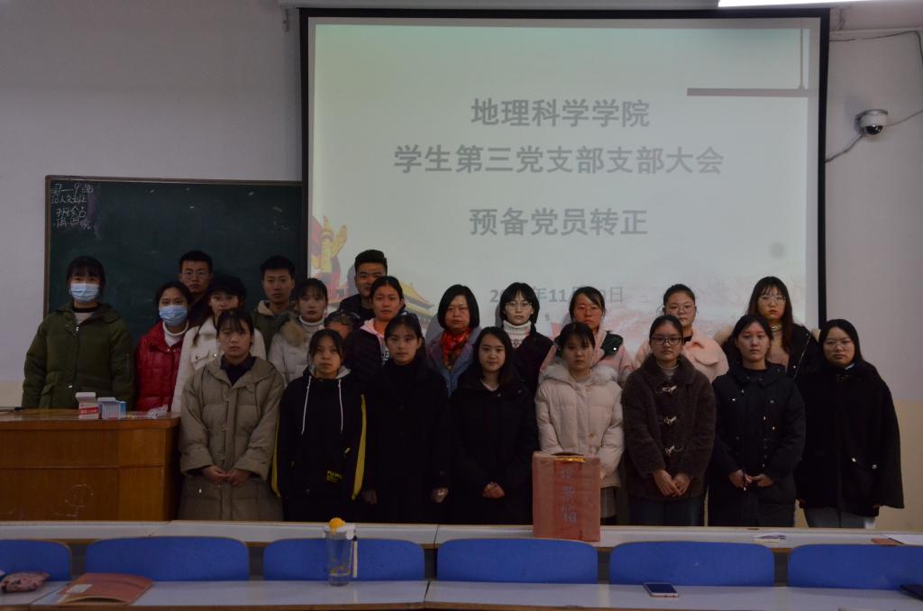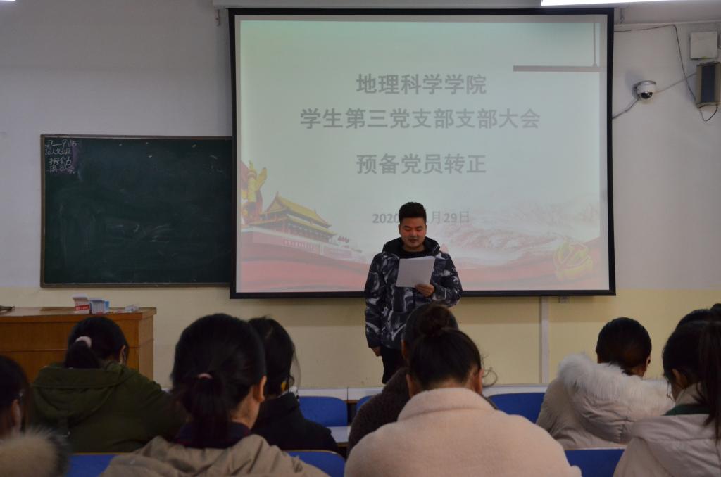 11月29日,太阳集团tyc234cc学生第三党支部于教三04召开2020年下半年预备党员转正大会,学生第三党支部书记杨辉、学生第三支部全体党员参加本次会议。会议由张世可主持。