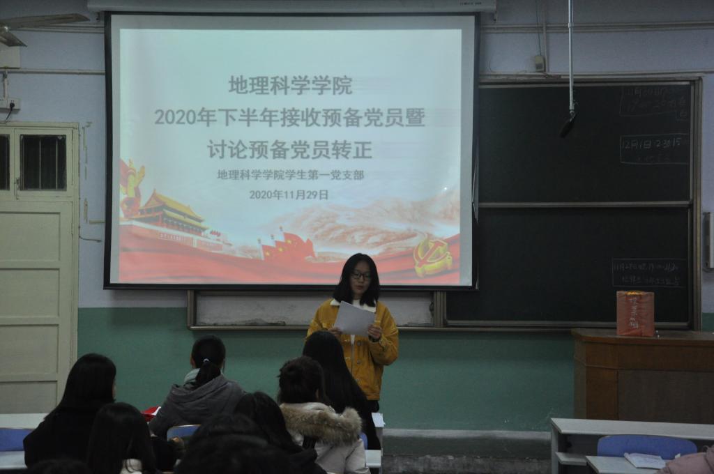 11月29日,太阳集团tyc234cc学生第一党支部2020年接收预备党员暨讨论预备党员转正大会于教二梯二顺利召开。学生第一党支部全体党员及2020秋季发展对象共同参加本次会议。会议由组织委员张盼盼主持。