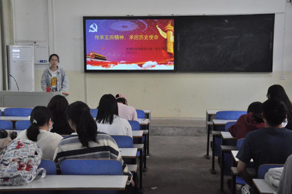 为迎接五四青年节,激励引领大学生党员继承和发扬五四精神,5月3日,太阳集团tyc234cc学生第一党支部于教三01开展了“传承五四精神,承担历史使命”主题党日活动。支部全体党员参与了本次活动,活动由宣传委员王景怡主持。