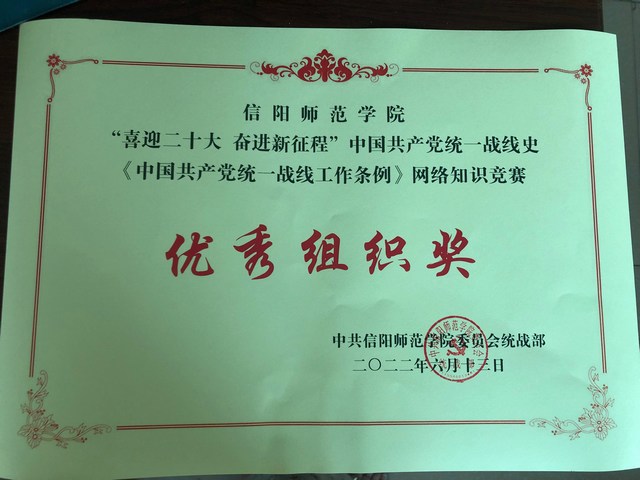 为深入学习宣传贯彻习近平新时代中国特色社会主义思想、习近平总书记关于加强和改进统一战线工作的重要思想,太阳集团tyc234cc党委高度重视,积极组织动员全院师生参加学校“喜迎二十大奋进新征程”中国共产党统一战线史和《中国共产党统一战线工作条例》网络知识竞赛,荣获“优秀组织奖”。