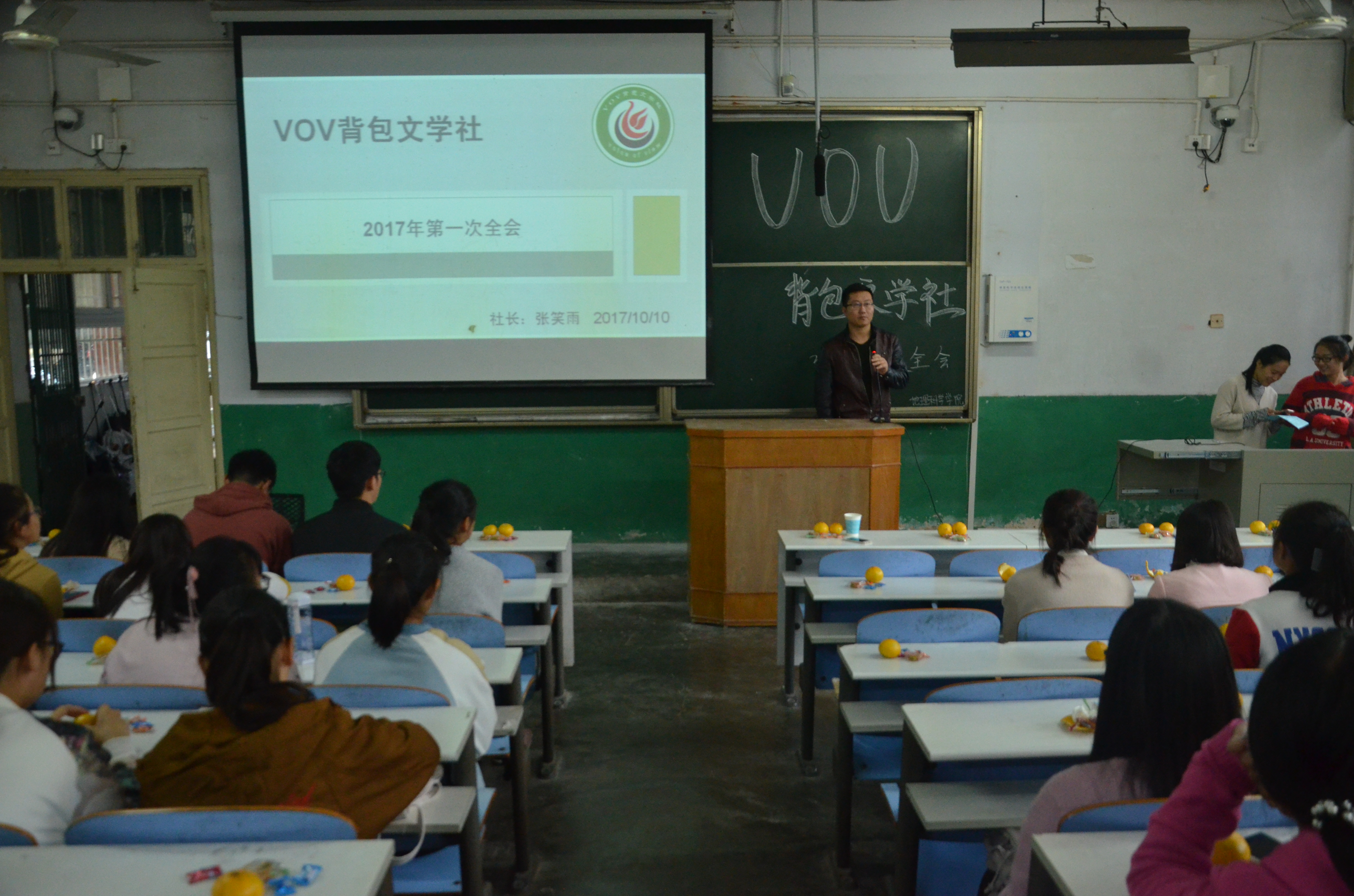 10月11日,VOV背包文学社于教二梯二召开第一次全会,太阳集团tyc234cc分团委老师、社团指导老师徐柏林,太阳集团tyc234cc分管社团副主席孙春猛、前任社长李若雨及各兄弟社团负责人与百余名新社员一同参加了本次全会,本次会议由社长张笑雨主持。