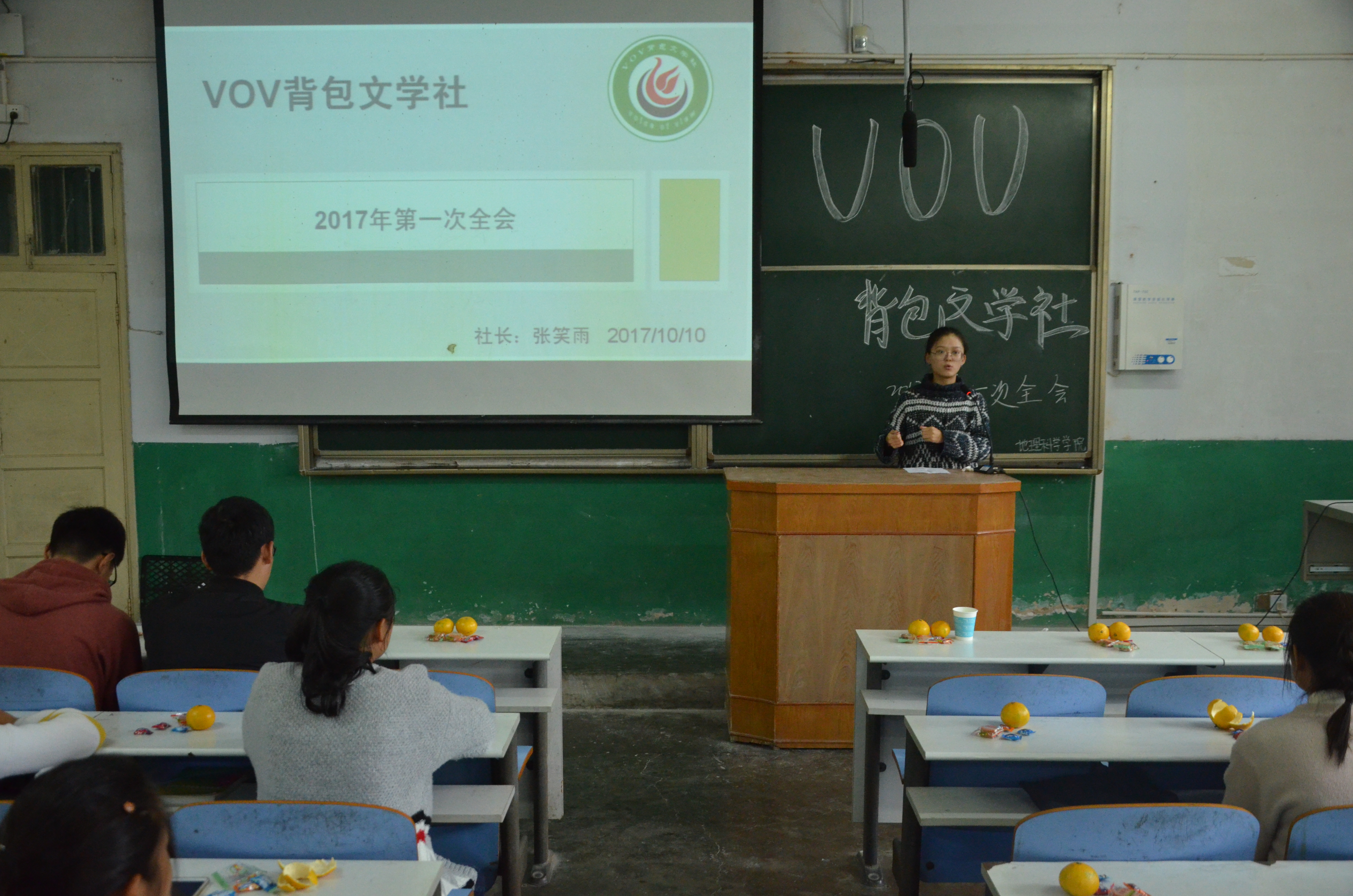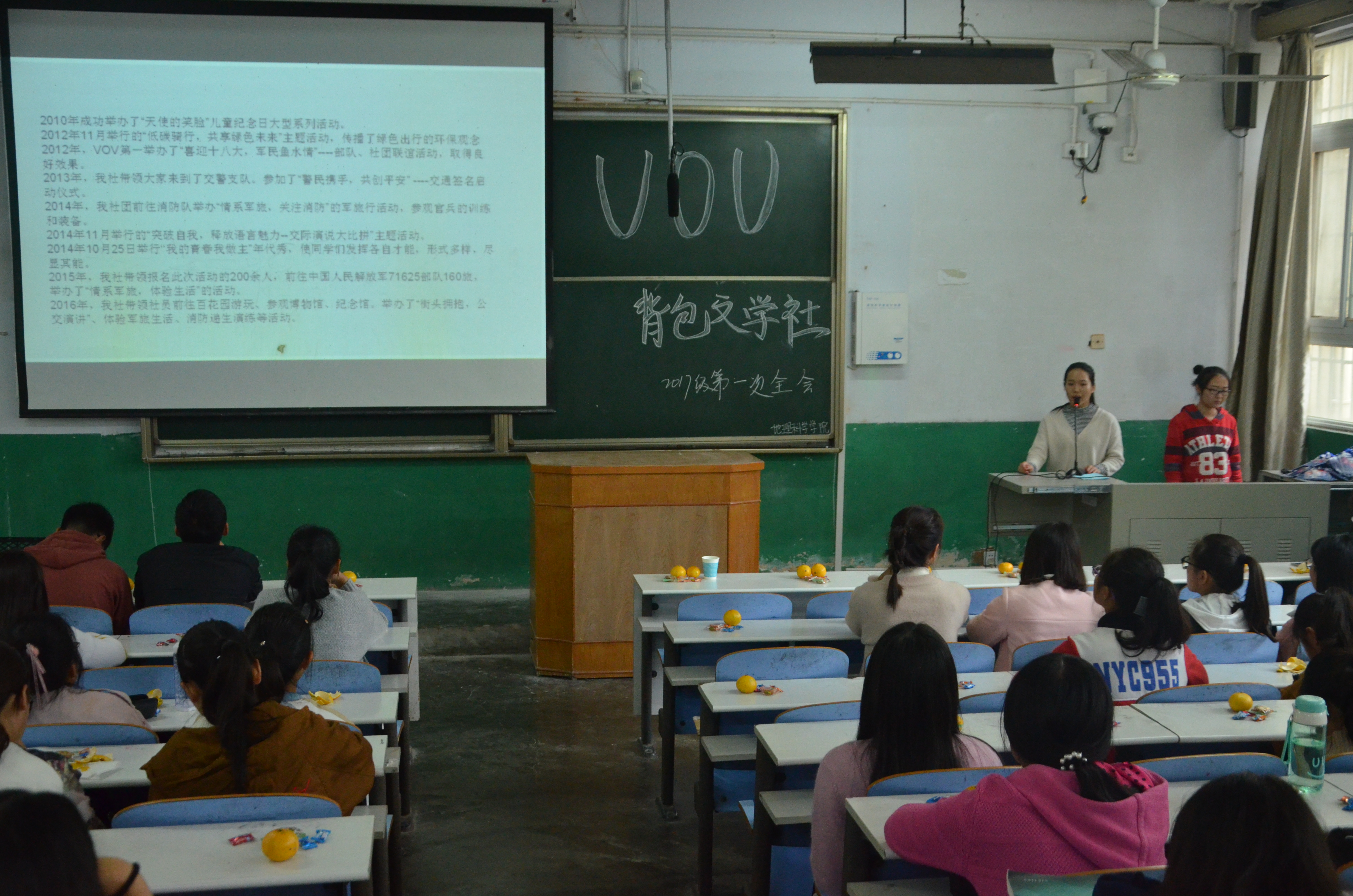 VOV背包文学社前任社长李若雨就上年的工作情况作出简要概述,希望社团在新一任理事会成员的带领下继续发展。随后社团各部门负责人依次上台对该部门的特点进行详细介绍,并欢迎在座新生的加入。会议最后,现任社长张笑雨向以PPT的形式向大家展现“公交演讲”、“军旅行”、“共建礼仪之邦——主题教育讲座”等特色精品活动,并着重强调今年将会新增入“与爱同行——公益活动”,社团成员将在社长的带领下前往残障儿童福利院,关爱儿童,承担起社会责任。