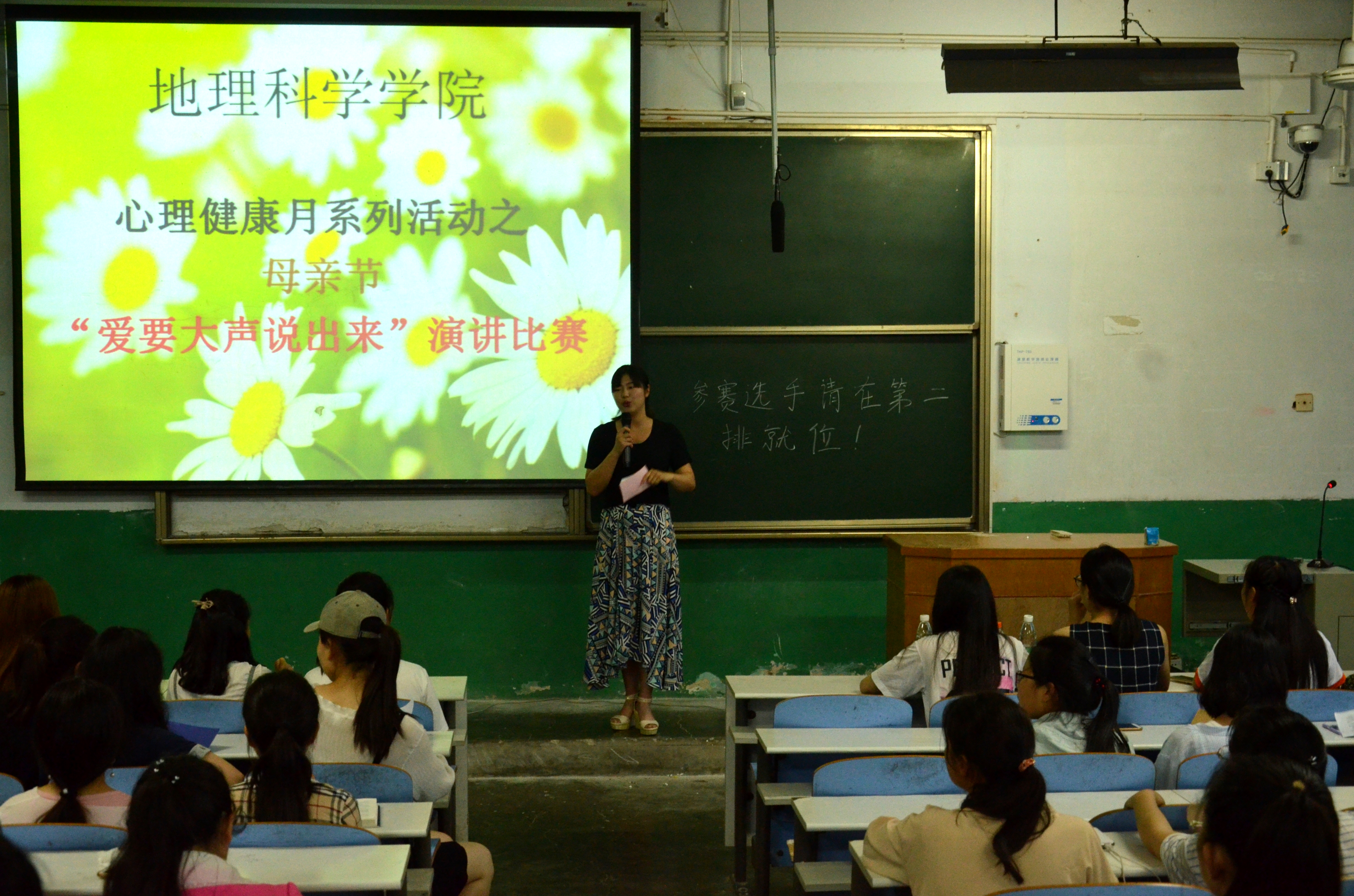 谁言寸草心,报得三春晖。5月12日,为迎接母亲节的到来,由太阳集团tyc234cc团委学生会心理部主办的“感恩有你,快乐人生”心理健康宣传月系列活动之母亲节“爱要大声说出来”演讲比赛在教二梯二隆重举行。地理学院学生会副主席逯志远、张茹,心理部部长余海珍,文艺部副部长刘航等学生会各部门部长副部7人受邀担任评委,与学院16级百余名学生共同观看了此次比赛。本次比赛由何敏主持。