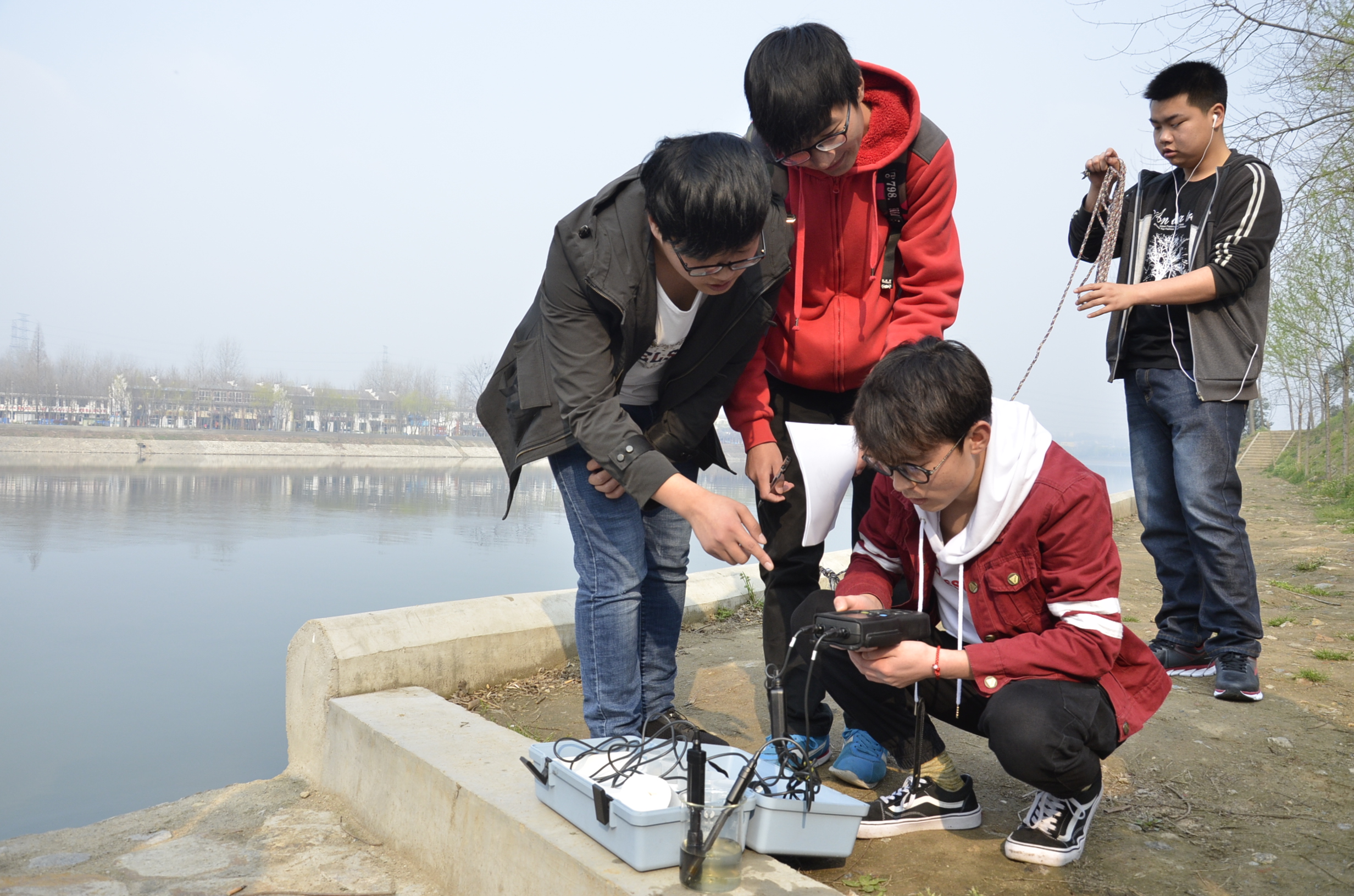 为配合3月22日世界水日活动,志愿者对浉河沿岸居民区进行走访,并发放《水资源优化使用之家庭节水问卷调查表》,询问他们关于家庭节水的一系列问题并宣传节水方法。随后,志愿者沿河前往浉河源头南湾水库,途中观察了河流现状(水的颜色、气味、河面漂浮物、水生动植物、建筑物等)。他们还对考察过程进行记录,同时对南湾湖、浉河采集水样,采取观察水的颜色、闻水的气味、采样进行ph值判断等多种方法检测;此外,志愿者还对沿途的排污口进行观察,记录其直径大小、污水流量,并对污水取样保存编号,以待在实验室进行分析。