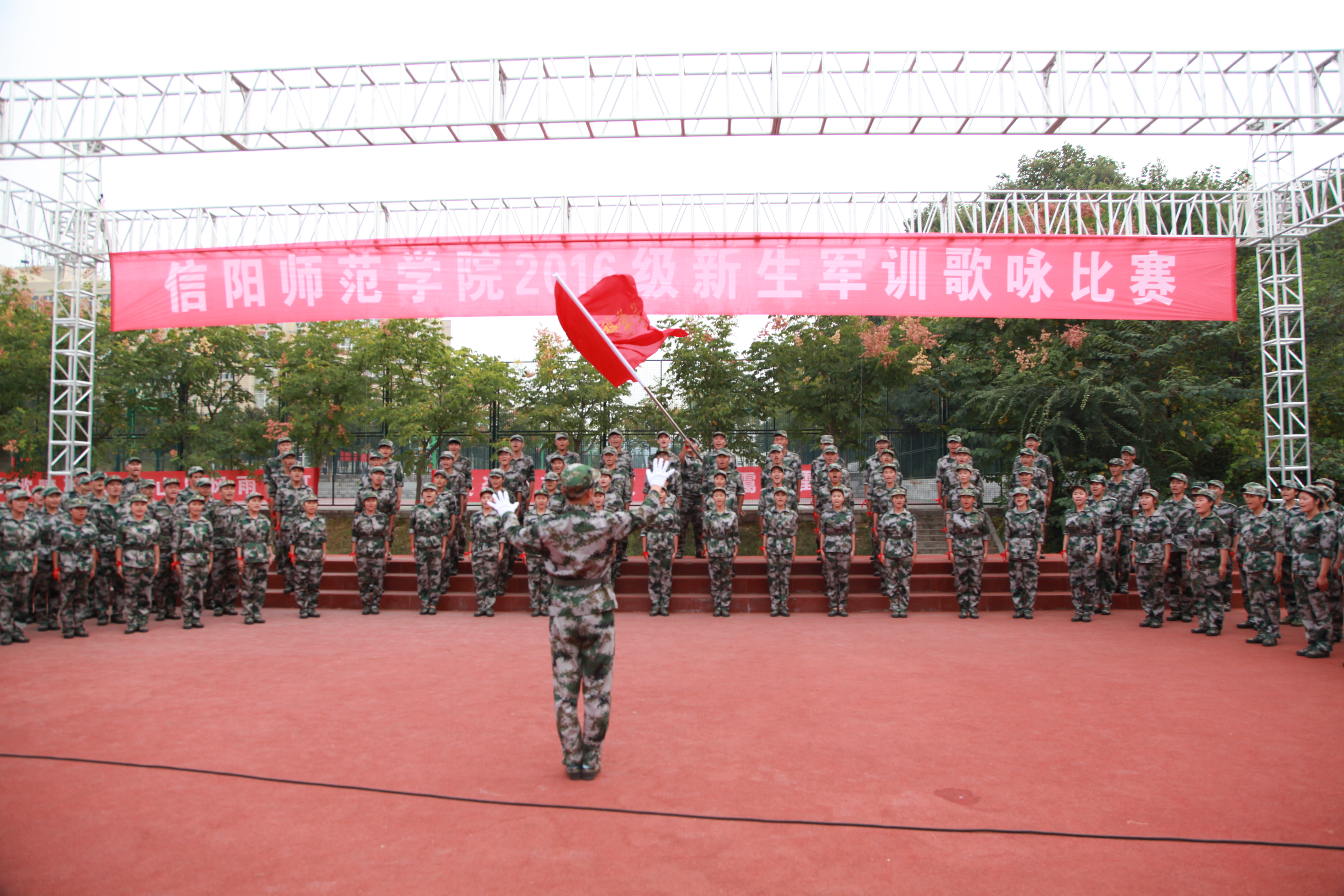 军歌嘹亮颂军魂,蓬勃向上展英姿。9月19日下午,信阳师范学院2016级新生军训歌咏比赛在青年广场顺利举行。信阳师范学院团委领导老师,71872部队及学校相关职能部门领导出席比赛并担任评委。