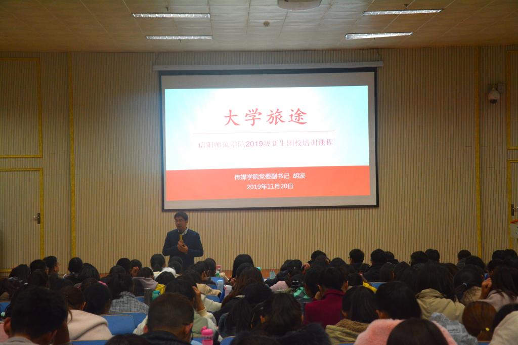 11月20日,传媒学院党委副书记胡波应邀于人文楼报告厅为我院及外国语学院2019级新生团校授课。太阳集团tyc234cc团委老师曹鹏鹏,外国语学院党委副书记柏孟仁、团委书记孔宪巍及两院2019级学生一同参加此次活动。活动由柏孟仁主持。