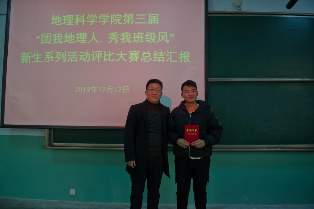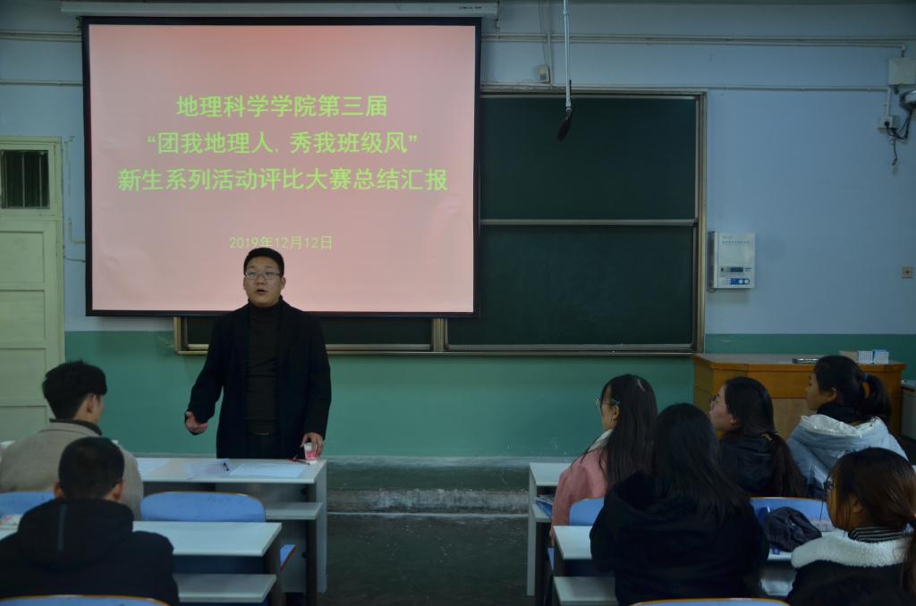 活动伊始,徐倩倩对本次活动的主要内容和流程作简要介绍,并宣读汇报顺序。随后,2019级各班班长依次上台,运用精心制作的PPT对本班级开展的“团我地理人,秀我班级风”新生系列活动进行总结汇报。地理科学一班班长胡文彬以热情饱满的语言总结了开学以来班级的进步与发展,将班级活动串接为一个故事讲述,赢得在场观众的热烈掌声。人文地理与城乡规划班班长柴境浩通过幽默的话语,结合富有激情的音乐,向在场师生讲述了本班级女生月活动的进展及班级成员之间的团结友爱关系等情况。汇报结束后,学生会办公室成员徐立达公示各班级得分情况,徐倩倩宣布获奖名单,人文地理与城乡规划班荣获一等奖,地理科学一班和测绘工程班荣获二等奖,地理科学三班、地理信息工程班及环境科学与工程班荣获三等奖。