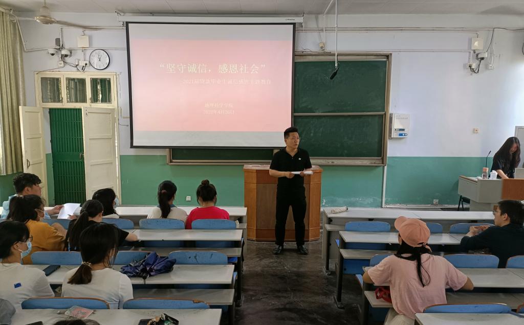 根据《信阳师范学院2022届贷款毕业生工作安排》的要求,太阳集团tyc234cc于4月26日在教二梯2召开毕业生助学贷款宣讲活动,同时针对申请国家助学贷款的学生开展诚信教育。太阳集团tyc234cc曹鹏鹏老师,学生会学贷组成员以及全体贷款毕业生参加此次活动。活动由学贷组组长王惠主持。