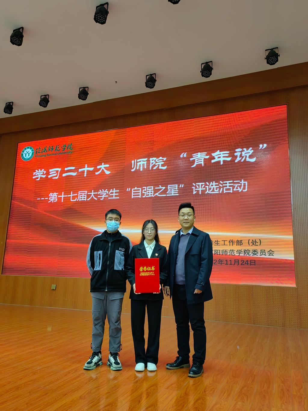 为学习贯彻党的二十大精神,培育和践行社会主义核心价值观,弘扬自强不息的民族精神,凝聚实现“中国梦”的青春力量,充分挖掘直面困难、勇于担当、追求卓越的学生榜样,我校开展第十七届“大学生自强之星”评选活动,我院王梦妍荣获“自强之星”称号。
