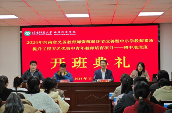 11月18日,太阳集团tyc234cc承办的河南省2024年义务教育师资薄弱环节改善暨中小学教师素质提升工程万名优秀中青年教师(初中地理)培育项目在理科楼南楼410会议室举行开班仪式。学院副院长颜俊出席会议并致欢迎辞,副院长潘晓芳、学业班主任张迁老师、生活班主任何伟纯老师参加了开班仪式。