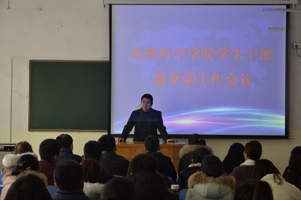 朱伟在会议上为学生干部作讲话,他指出,新年新学期的到来对学院学生工作意味着一个新的开始,一个新的阶段。希望学生干部们能起好带头模范作用,“撸起袖子加油干”。此外,朱伟还就学生心理健康工作和寝室安全卫生等问题提出了意见建议,并叮嘱学生干部们不能松懈,在新的一年里共同为地理科学学院取得更加辉煌的成绩。随后,辅导员徐柏林向学生干部们做出新学期学生工作的具体安排。他首先强调在活动策划方面要进行严格要求,做到“心中有数”、“善始善终”,在新学期各项活动中明确部门职责,创新活动理念,提前统筹安排,将工作做好干好发展好。在平日常规工作中,各部门之间要相互协调配合,加强交流,做到高效有序。