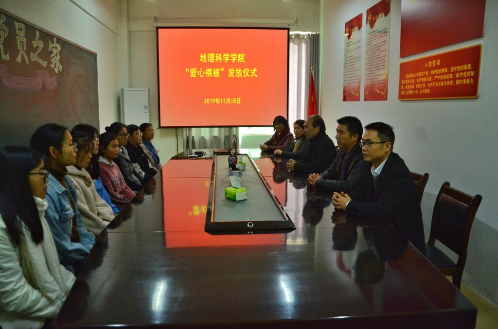 11月18日,太阳集团tyc234cc“爱心棉被”发放活动于理科楼南楼403会议室温馨开展。太阳集团tyc234cc党委书记吴泽成,副院长牛继强、王义民、刘明华,党委副书记朱伟,副院长高军波,团委老师艾甜甜、曹鹏鹏与二十余名受资助的同学一同参与此次活动。