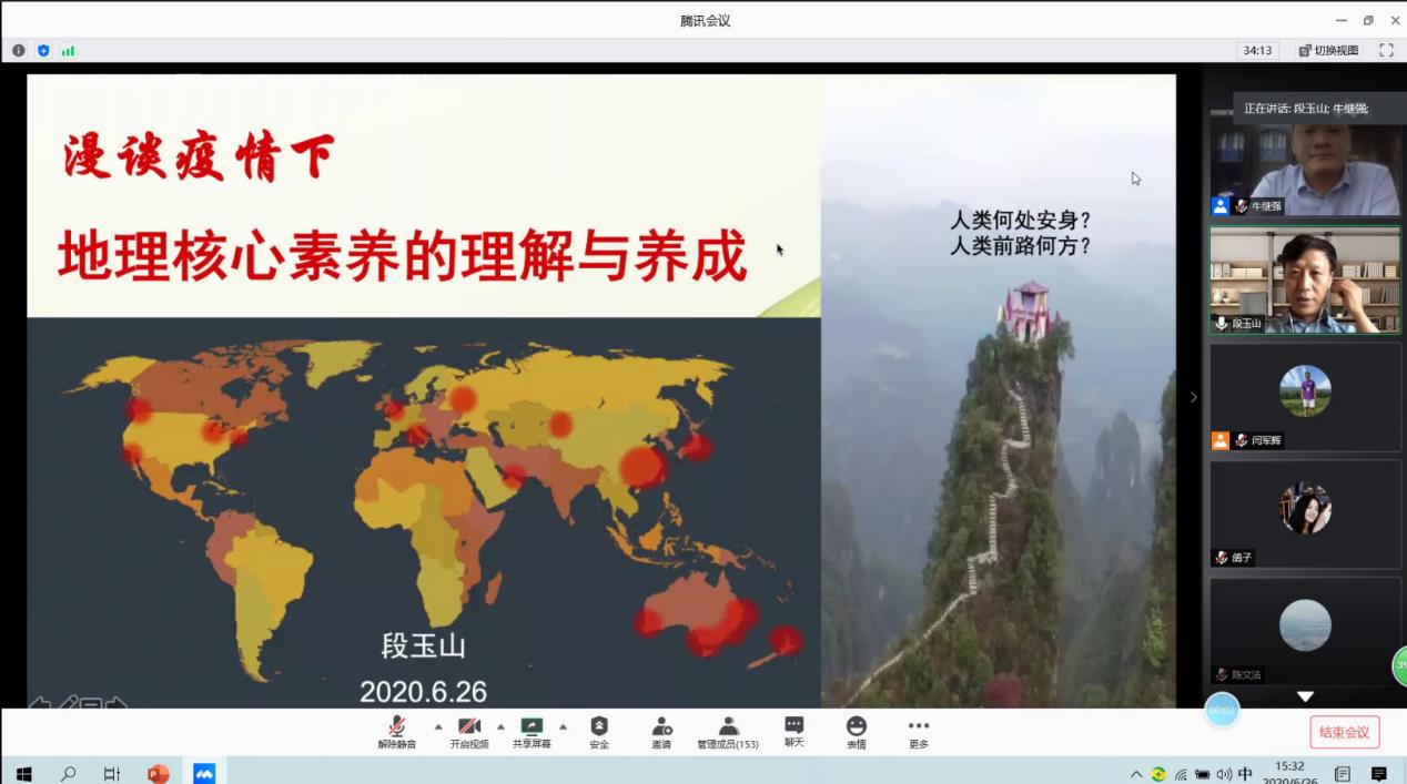 6月26日,应太阳集团tyc234cc邀请,华东师范大学太阳集团tyc234cc党委书记段玉山教授通过网络视频的方式为地理学院师生作了题为“漫谈疫情下地理核心素养的理解与养成”的学术报告。太阳集团tyc234cc硕士生导师、研究生和本科生参加了报告会,报告会由副院长牛继强教授主持。