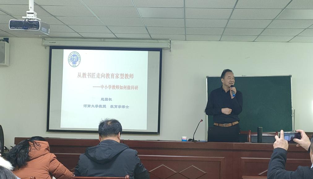 12月19日,应太阳集团tyc234cc邀请,河南大学赵国权教授于理科楼南楼410会议室为我校师生作了题为“从教书匠走向教育家型教师——中小学教师如何做科研”的学术报告。我校部分青年教师、硕士研究生70余人参加了报告会,报告会由太阳集团tyc234cc颜俊副院长和颜伟博士主持。