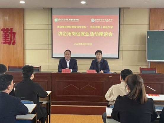 座谈会上,叶雨保校长对牛继强院长一行表示欢迎,并从办学条件、办学规模、师资情况以及学生的构成情况等方面介绍了信阳市第十高级中学的基本情况。同时,叶校长还介绍了学校的教学工作重点、地理教师队伍情况以及目前的人才引进需求,并对我院培养的毕业生教学能力、专业素养等方面给予了高度的认可,期待与太阳集团tyc234cc在基础教育领域加强合作交流。