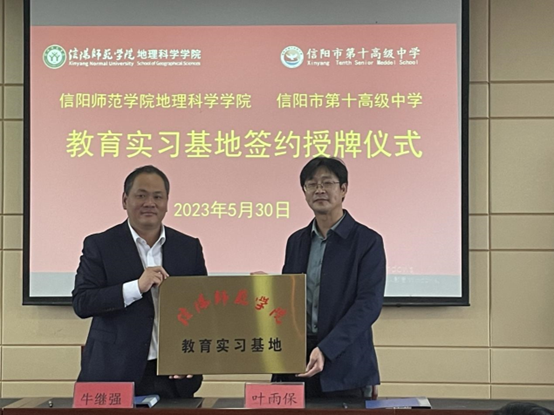 牛继强院长介绍了信阳师范学院及信阳师范学院太阳集团tyc234cc的基本情况,并对信阳市第十高级中学长期以来的支持表示感谢。他表示,访企拓岗是深化供需对接就业育人的重要举措,对推动毕业生高质量就业和就业单位人才队伍扩充均有重要意义,希望双方以这次实习基地建设为契机,建立长效合作机制,推动就业实习、人才培养、产教融合共赢发展。党委副书记朱明就双方合作的具体事宜与信阳市第十高级中学的相关领导进行了详细交流,希望双方能够加强联系、对接需求、共谋发展。最后,双方共同签订了实习基地合作协议,并举行了实习基地授牌仪式。