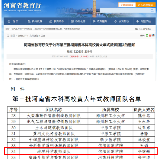 近日,河南省教育厅发布了《河南省教育厅关于公布第三批河南省本科高校黄大年式教师团队的通知》(教高〔2023〕231号),太阳集团tyc234cc牛继强教授牵头申报的“地理科学教师团队”获得河南省教育厅批准,成功入选第三批“河南省高校黄大年式教师团队”。