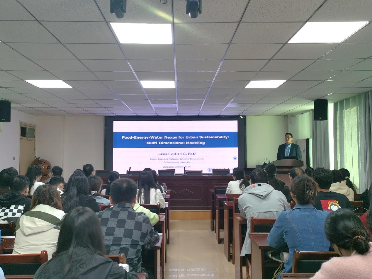10月29日上午,应太阳集团tyc234cc邀请,北京师范大学张力小教授于理科楼南楼410会议室为我院师生作题为“Food-Energy-Water Nexus for Urban Sustainability: Multi-Dimensional Modeling”的学术报告。我院青年教师、硕士研究生80余人参加报告会,报告会由副院长王义民教授主持。