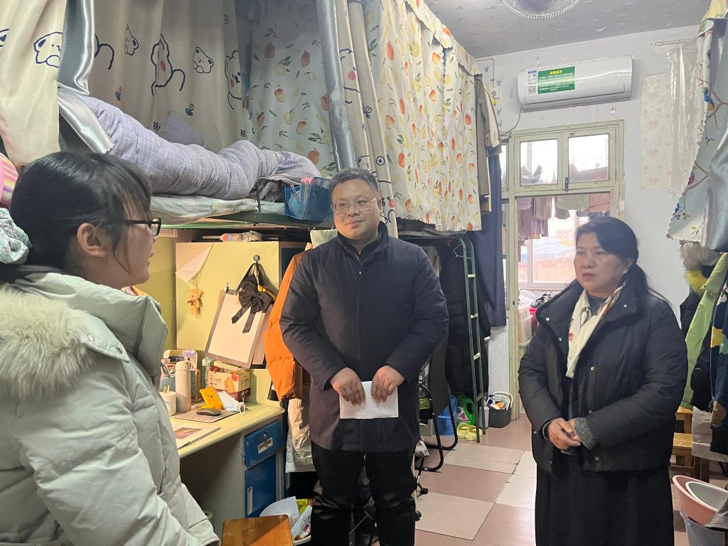 在走访过程中,宋力亲切地询问了同学们的学习进展、生活状况和心理状态,提醒同学们注意身体,加强体育锻炼,养成良好的生活习惯,保持积极乐观的心态,并了解同学们遇到的困难和问题,表示学校将全力以赴确保各项措施落实到位,尽可能满足同学们学习和生活需要。宋力不断向同学们强调宿舍安全问题,叮嘱同学们在注意防寒保暖的同时,严禁在宿舍使用违规电器,不私拉电线,遵守各项纪律。她表示,同学们有缘住到同一间宿舍,大家要互帮互助,相互学习,共同进步,凝聚每个人的力量,共同营造积极向上的宿舍环境。领导老师们温暖的话语、亲切的问候,让同学们深深感受到这个大家庭的温暖。大家也纷纷表示会牢记领导老师们的教诲和嘱托,在今后的学习和生活中严格要求自己,以饱满的精神状态投入专业学习,努力成为一名优秀的师大学子,不辜负老师的期望,不忘初心,奋力前行。