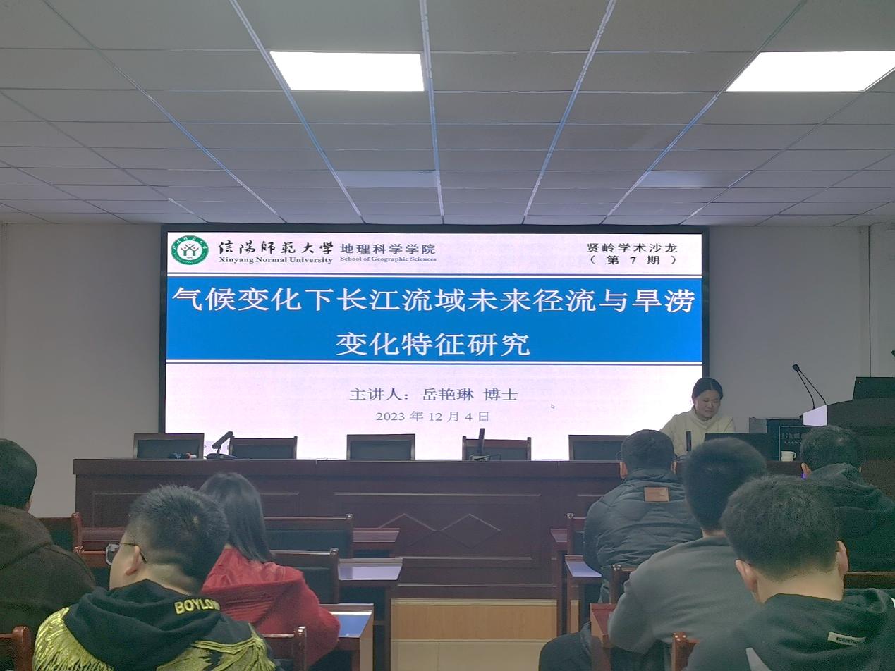 报告会上,岳艳琳博士从全球气候变化的背景出发,指出长江流域的水循环和水资源的变化对中国社会经济发展有重大影响。随后,基于FLUS模型模拟了长江流域未来土地利用变化,并结合可靠性更高的CMIP6 GCMs数据,预测了气候变化和土地利用变化共同影响下的长江流域21世纪中期径流变化特征。最后,岳老师在预测流域未来径流变化的基础上,量化模拟了三种SSP-RCP情景下长江流域21世纪中期水文干旱和洪涝灾害风险的变化趋势,该研究可为长江流域防灾减灾和生态可持续发展提供科学有效的决策支持。岳艳琳博士的报告紧扣学科前沿热点,以翔实的数据和深入的分析,阐述了自己在科学问题凝练和科研工作开展中的思考,不仅开阔了与会师生的学术视野,也启发了与会师生的科研思维,对全面提升我院研究生的科研能力具有重要意义。
