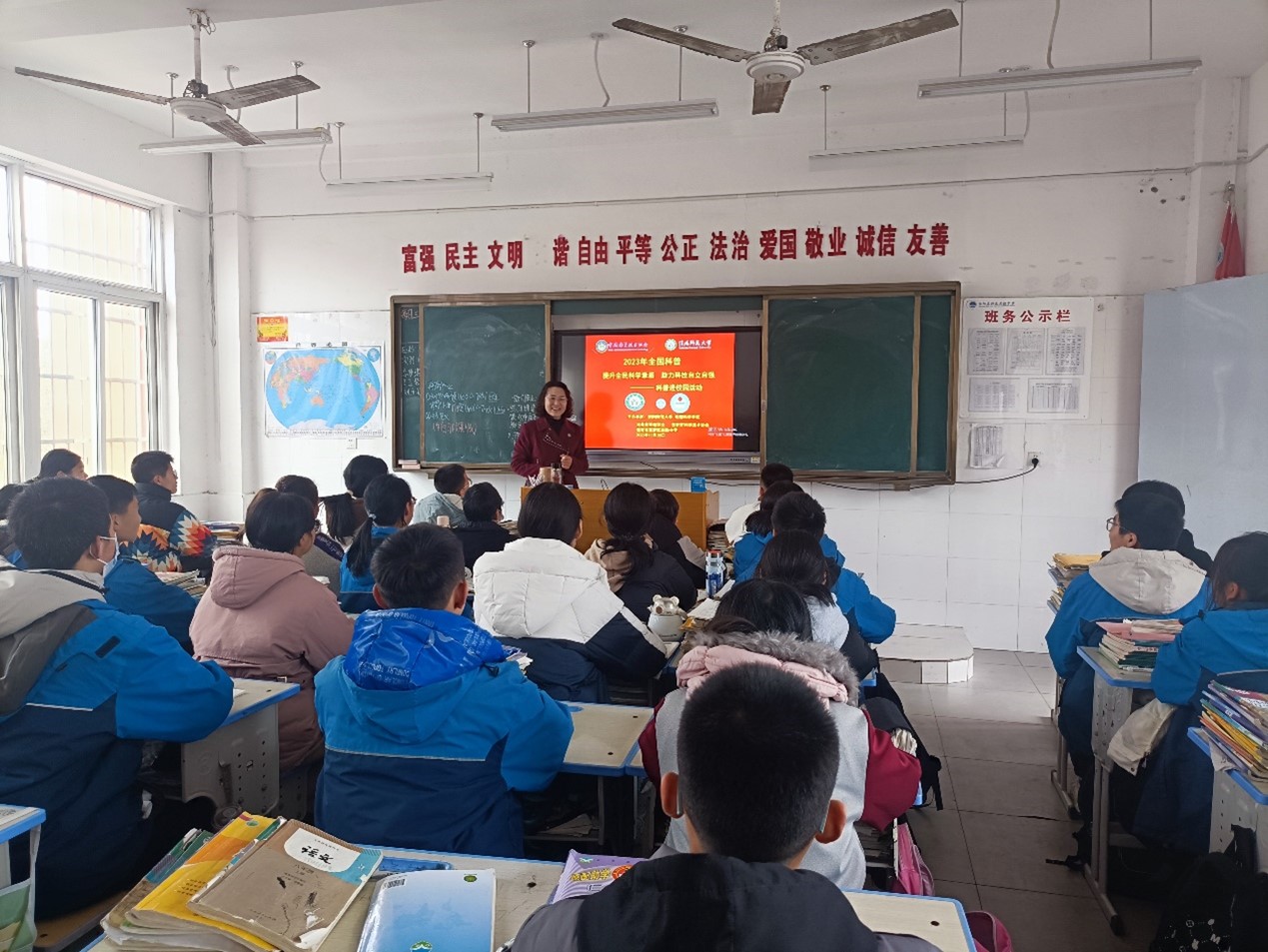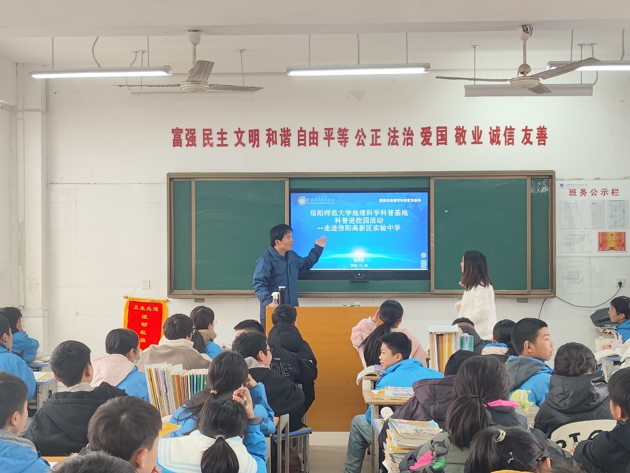 为加强科普资源助推“双减”常态化合作,应信阳市高新区实验中学邀请,12月1日太阳集团tyc234cc地理科学科普基地刘明华教授、张兴国副教授、史兴俊副教授、张辰光副教授、张中典博士为7年级、8年级同学们开展“科普进校园”系列科普讲座活动。