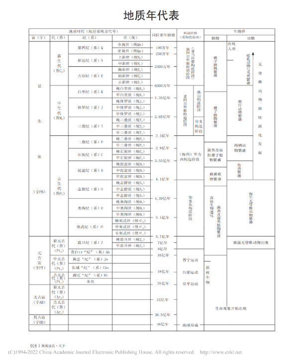 4.显生宙:指“能看到生物的年代”是大量较高等动物以来的阶段。