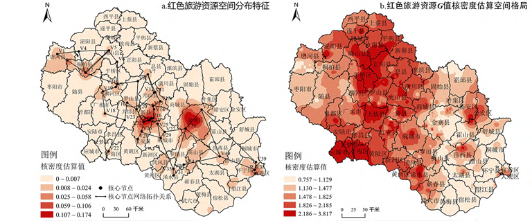 图1 大别山革命老区红色旅游资源空间分布格局及G值核密度估算示意图