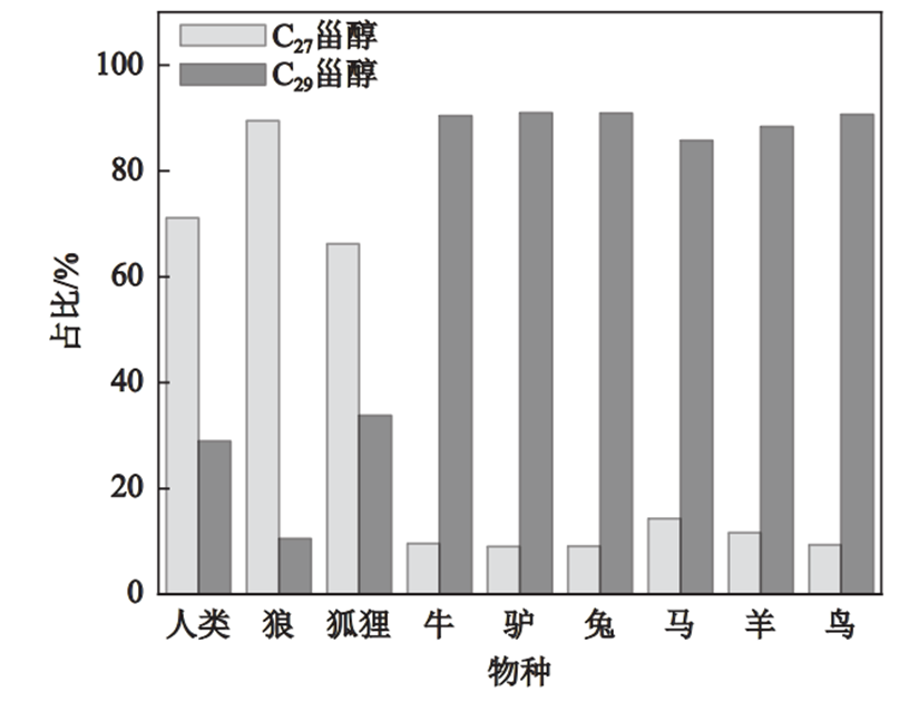 首先,研究者通过对粪便成分的对比分析发现,粪甾烷醇和异构粪甾烷醇在人类粪便总甾醇质量浓度中占比超过60%,但在其它物种中占比仅为0.66%-10.04%,且人类粪便中这2种甾醇化合物的质量浓度为5349.0μg/g,而其他8个物种粪便中二者的质量浓度总和仅为2553.4μg/g,后者不到前者的1/2,因而粪甾烷醇和异构粪甾烷醇可用作夏达错地区人类活动的示踪剂;胆固醇在狐狸和狼等食肉动物粪便总甾醇中的占比均超过了50%,而在其它物种中的占比均小于7%,可用于示踪食肉动物;β-谷甾醇在鸟类粪便总甾醇中占比超过85%,远高于其在其他物种粪便总甾醇中占比,可用于识别植食性鸟类。